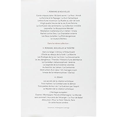 I. ROMANS ET NOUVELLESConte crépusculaire / Brûlant secret / La Peur / AmokLa Femme et le Paysage / La Nuit fantastiqueLettre d?une inconnue / La Ruelle au clair de luneVingt-quatre heures de la vie d?une femmeLa Confusion des sentiments / La Collection invisibleLeporella / Le Bouquiniste MendelRévélation inattendue d?un métier / VirataRachel contre Dieu / Le Chandelier enterréLes Deux Jumelles / La Pitié dangereuseLe Joueur d?échecsII. ROMANS, NOUVELLES ET THEATREDans la neige / L?Amour d?Erika EwaldL?Etoile au-dessus de la forêt / La MarcheLes Prodiges de la vie / La Croix / La GouvernanteLe Jeu dangereux / Thersite / Histoire d?une déchéanceLe Comédien métamorphosé / JérémieLa Légende de la troisième colombeAu bord du lac Léman / La ContrainteDestruction d?un c?ur / Un mariage à LyonIvresse de la métamorphose / ClarissaIII. ESSAISLes secrets de la création artistiqueTrois maîtres / Le Combat avec le démonTrois poètes de leur vie / La Guérison par l?espritLe Mystère de la création artistiqueL?héritage européenErasme / Montaigne / Parole d?Allemagne / Le Mondesans sommeil / Aux amis de l?étranger / La Tour de BabelAllocution / Pour la Freie Tribune ParisEn cette heure sombre